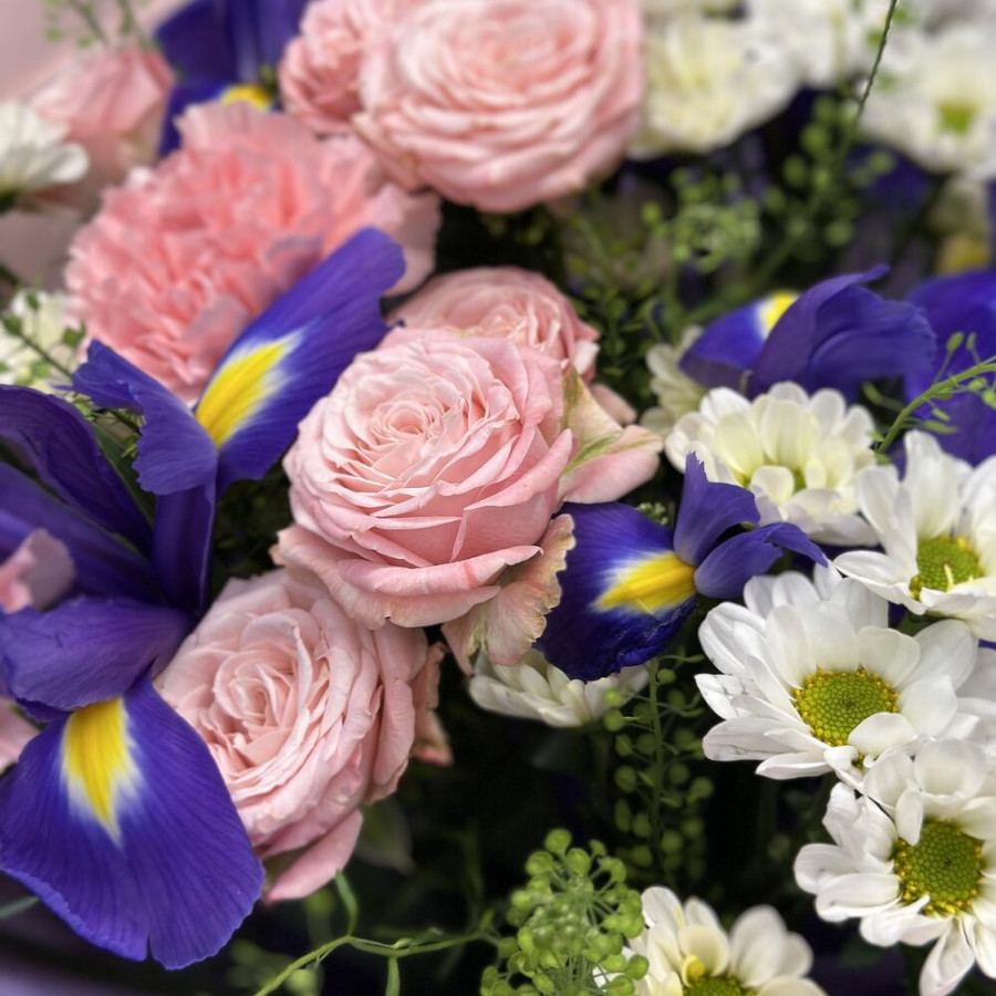 На фото букет «розовый блюз». В составе: кустовая роза 3 шт, гвоздика 3 шт, хризантема кустовая 3 шт, ирис 5 шт, дизайнерская упаковка 1 шт, атласная лента 1 шт, . Все цветы свежие и ароматные, букет красиво оформлен и отлично подходит для подарка. Доступна доставка цветов или самовывоз.